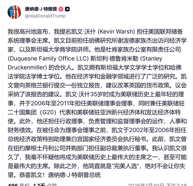 沃什曾于2006年至2011年担任美联储理事会理事,并且此前也曾就经济政策向特朗普提供建议。若提名成行,他将在现任主席杰罗姆·鲍威尔(Jerome Powell)于5月任期届满后接任。这也意味着沃什“回归”核心岗位——2017年特朗普曾考虑过他,但最终选择了鲍威尔担任美联储主席。沃什现年55岁。