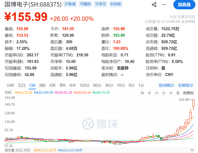 国博电子公告称,公司股票交易连续三个交易日收盘价格涨幅偏离值累计达到30%,属于股票交易异常波动情形。经自查和核实,公司目前生产经营活动一切正常,未发生重大变化。除已披露信息外,公司及控股股东、实际控制人及其一致行动人不存在应披露而未披露的重大信息。公司有源相控阵T/R组件和系列化射频集成电路产品主要应用于雷达探测等特种领域,在民用通信卫星领域的营收占比较小。公司滚动市盈率为218.58倍,显著高于行业平均水平。