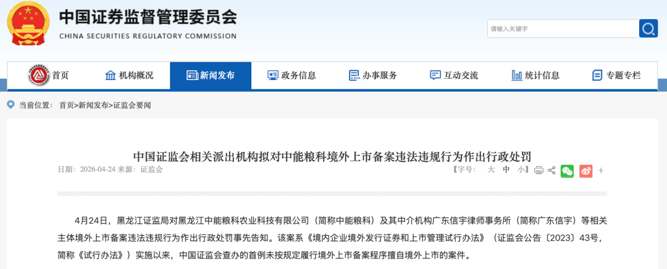 4月24日,中国证监会通报了首例未按规定履行境外上市备案程序擅自境外上市的案件,中能粮科及其中介机构广东信宇等相关主体拟被处罚。