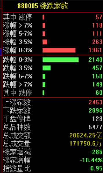 两市共2453只个股上涨,57只个股涨停,2896只个股下跌。