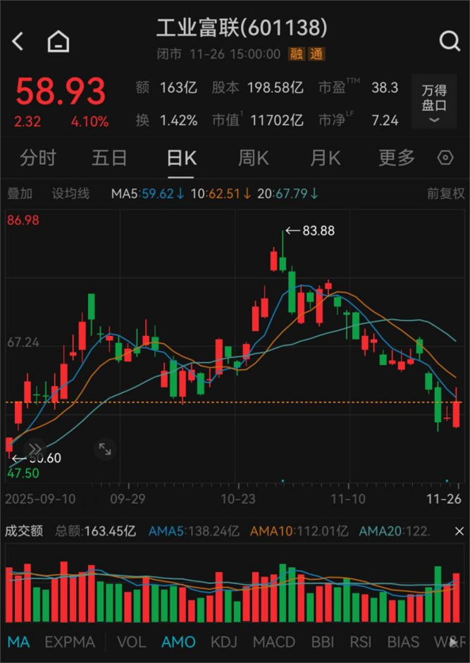 股价方面,工业富联在10月末创下历史新高,11月以来出现震荡下跌,11月24日盘中更是一度触及跌停板。公司于当日晚间发布澄清公告称,公司未向市场下调第四季度利润目标,不存在应披露未披露的信息。同时,与客户合作开发的下一代产品,也正在按前期的计划如期顺利推进当中。