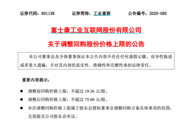 【导读】工业富联将回购价上限从每股19.36元提高至75元