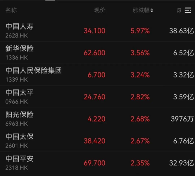 中国人寿涨近6%,新华保险、中国人民保险集团、中国太平等均收涨。