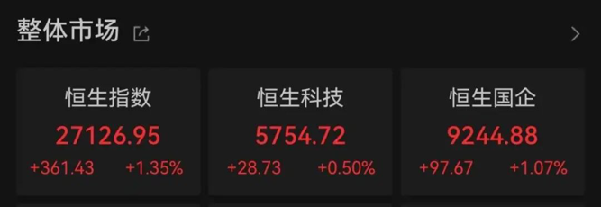 截至收盘,恒生指数涨1.35%,报27126.95点;恒生科技指数涨0.50%,报5754.72点;恒生国企指数涨1.07%,报9244.88点。
