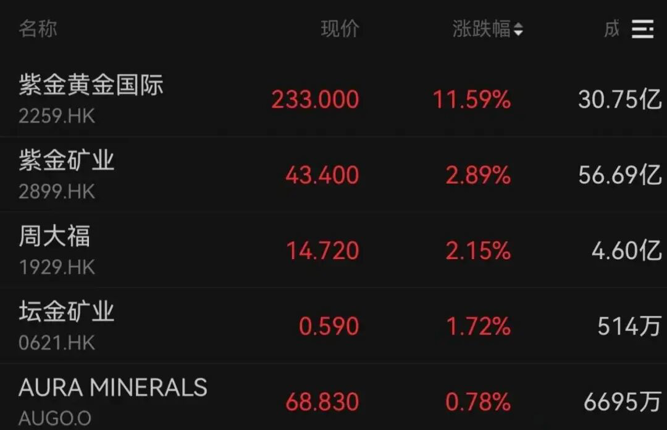 黄金股部分活跃,紫金矿业收涨2.89%,报43.40港元/股。