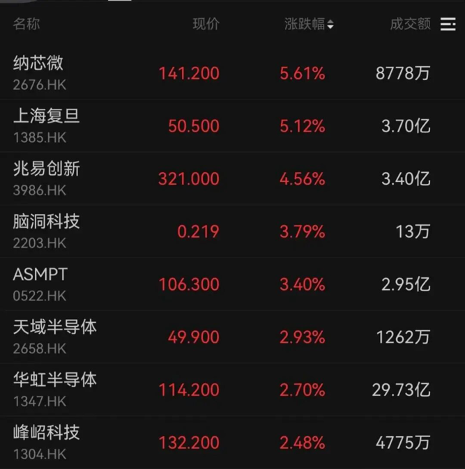 半导体板块中,纳芯微、上海复旦涨超5%,兆易创新、脑洞科技、ASMPT分别上涨4.56%、3.79%、3.40%。