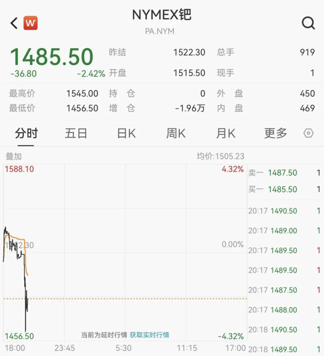 NYMEX钯金期货主力最新报1485.5美元/盎司,日内跌2.42%。