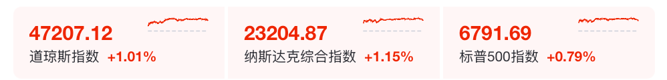 美国三大股指集体收涨,均创历史新高。截至收盘,道指涨1.02%,标普500指数涨0.79%,纳指涨1.15%。