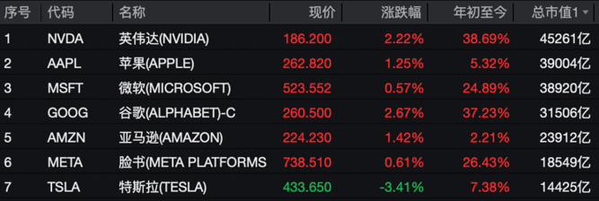 板块方面,大型科技股普涨,万得美国科技七巨头指数大涨1.17%,英伟达涨2.22%,谷歌涨2.67%,亚马逊涨1.42%,苹果涨1.25%。