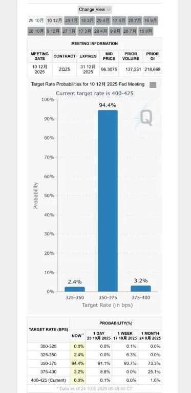 根据CME美联储利率观察工具,12月降息的概率从数据公布前的约91.1%增至94.4%,而下周降息的概率仍高于95%。