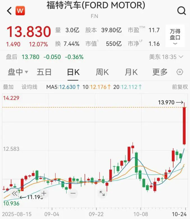 10月24日,福特汽车大涨12%,现报13.83美元/股,最新市值为550亿美元。