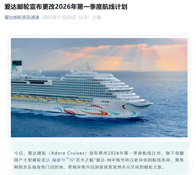 近期,爱达邮轮(Adora Cruises)宣布更改2026年第一季度航线计划,旗下爱达·魔都号与爱达·地中海号将聚焦韩国及东南亚热门目的地。