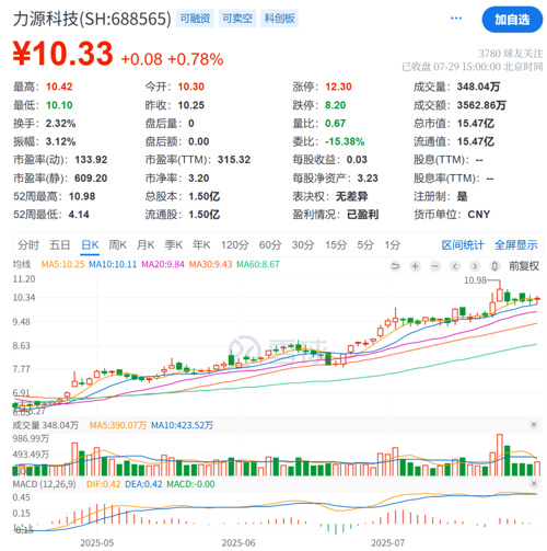 截至7月29日收盘,力源科技股价为10.33元/股,总市值为15.47亿元。