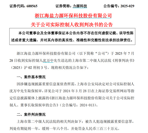 7月29日晚间,力源科技发布公告称,其收到实控人沈万中送达的上海市第二中级人民法院《刑事判决书》。沈万中犯违规披露重要信息罪,被判处有期徒刑一年,缓刑一年六个月,并处罚金330万元。