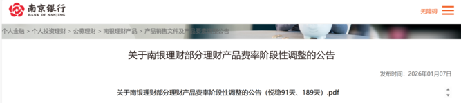 1月7日,南银理财发布公告,调整持有期为91天和189天的悦稳系列产品的固定管理费和销售费。