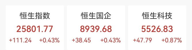 截至收盘,恒生指数上涨0.43%,报25801.77点;恒生科技指数上涨0.87%,报5526.83点;恒生中国企业指数上涨0.43%,报8939.68点。