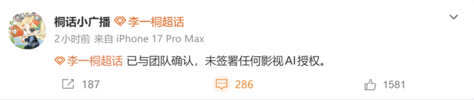 同期,于和伟、李一桐、王玉雯、陈哲远等多名艺人或旗下团队、粉丝会等纷纷发声,称“未签署任何影视AI授权”“大家不信谣不传谣”。