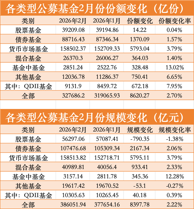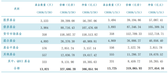 公募基金整体份额及规模均实现2%以上的增长。截至2026年2月底,公募基金整体份额达到32.77万亿份,单月增加8620.27亿份,较1月末增长2.7%;公募基金整体规模达到38.61万亿元,单月增加8397.78亿元,环比增长2.22%。