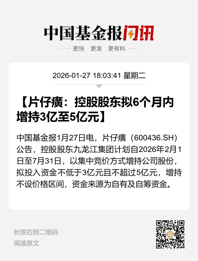 片仔癀1月27日晚发布公告称,基于对公司未来持续稳定发展的信心和长期投资价值的认可,公司控股股东漳州市九龙江集团有限公司(以下简称九龙江集团)计划自2026年2月1日起至2026年7月31日(即6个月内),以自有及自筹资金,通过上海证券交易所交易系统以集中竞价方式增持公司股份,合计拟增持金额不低于3亿元(含)且不超过5亿元(含)。本次增持计划不设定价格区间,将根据公司股票价格波动情况及资本市场整体趋势,择机逐步实施增持计划。