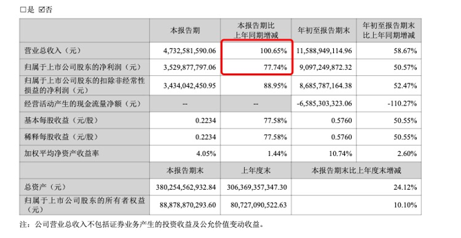 10月24日晚,东方财富披露三季报。第三季度实现营业总收入47.33亿元,同比大增100.65%;实现净利润35.3亿元,同比增长77.74%。