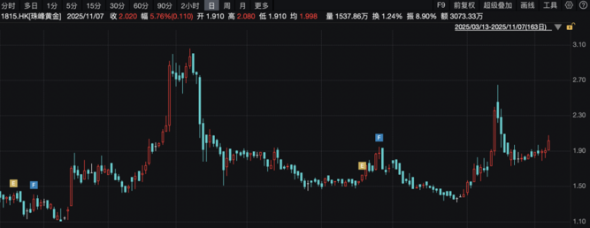11月7日,部分黄金股逆市上涨。例如,珠峰黄金大涨5.76%、周六福涨5.44%,万国黄金集团涨2.86%。不过,也有黄金股下挫。例如,大唐黄金大跌7.02%,周生生跌3.51%,周大福跌2.33%,老铺黄金跌2.94%。