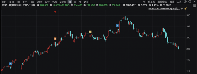 11月7日,潮玩龙头泡泡玛特大跌5.88%。