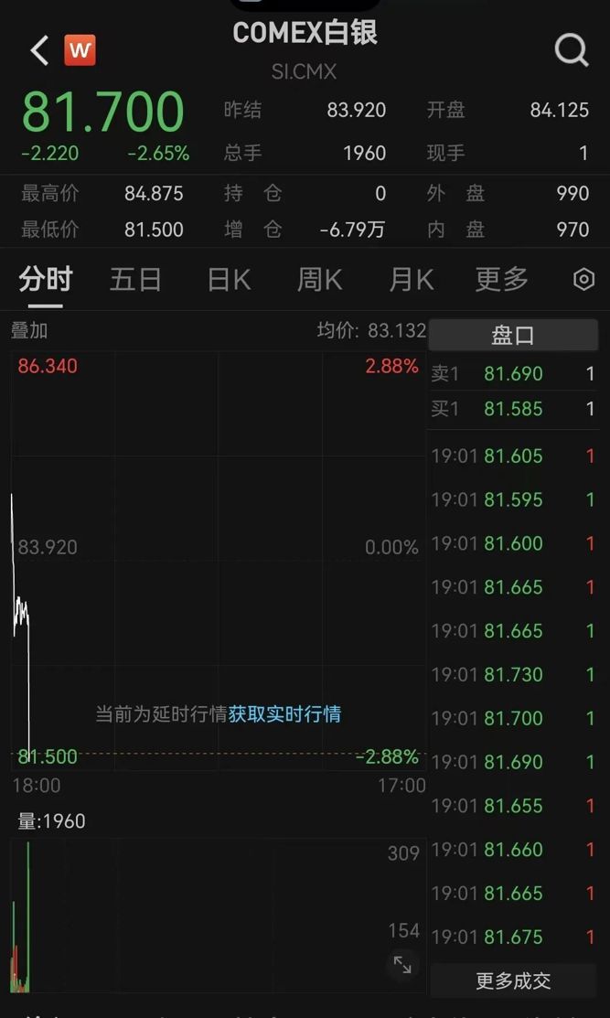 2月12日开盘,COMEX白银期货价格掉头向下。截至记者发稿,报81.7美元/盎司,跌2.65%。