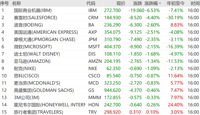 IBM跌6.53%,赛富时跌4.40%,波音跌2.60%,领跌道指成份股。