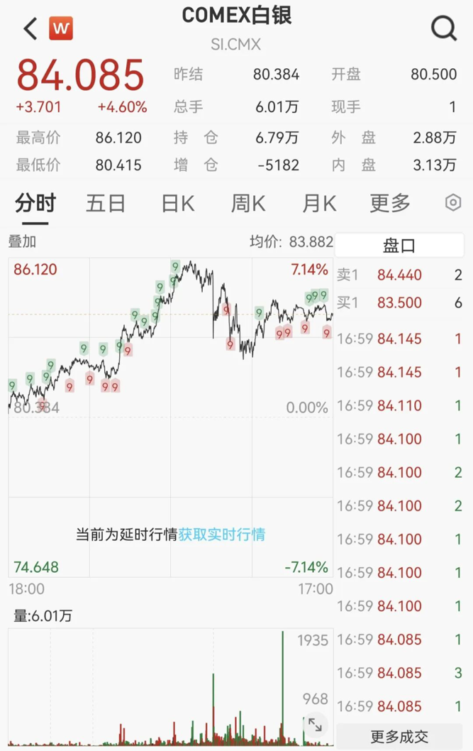 COMEX白银期货一度大涨7.14%,收报84.085美元/盎司,涨4.60%。
