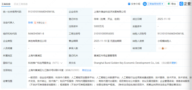 企查查信息显示,上海外滩金科经济发展有限公司(以下简称外滩金科)已注册成立,成立日期为11月10日,注册资本为5000万元,法定代表人为陈萌。同时,该公司股东包括上海黄浦科创集团有限公司和上海信托。