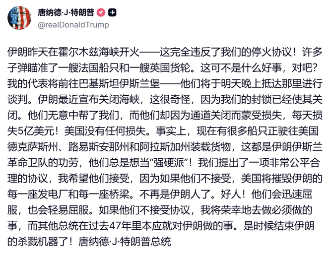 特朗普在社交平台发文称:“伊朗昨天在霍尔木兹海峡决定开火,这完全违反我们的停火协议!其中多发射击瞄准了一艘法国船只和一艘英国货轮。这可不太友好,不是吗?我的代表们将前往巴基斯坦伊斯兰堡,他们明晚抵达那里进行谈判。伊朗最近宣布要关闭海峡,这很奇怪,因为我们的封锁已经关闭了海峡。他们在不知不觉中帮了我们的忙,而封闭航道只会让他们自己受损,每天损失5亿美元!每天损失5亿美元!我们正在提供一个非常公平合理的协议,我希望他们接受,因为如果他们不接受,美国将摧毁伊朗的每一座发电厂和每一座桥梁。好说话的日子结束了!他们会很快垮掉,轻易垮掉。如果他们没有接受协议,我将很荣幸地去做必须做的事情。”