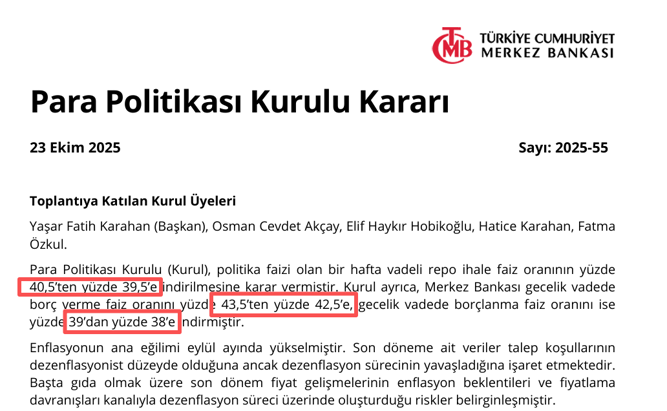 10月23日,土耳其央行货币政策委员会(MPC)宣布,将政策利率(即一周回购利率)从40.5%下调至39.5%。委员会还将央行隔夜贷款利率从43.5%下调至42.5%,将隔夜借款利率从39%下调至38%。