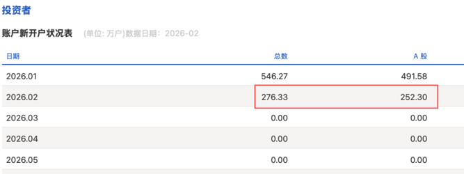 3月3日,上交所披露的数据显示,2026年2月A股新开户252.3万户,环比1月的491.58万户下降49%,同比2025年2月下降11%;同期基金新开户23.97万户,环比1月54.63万户大幅回落。