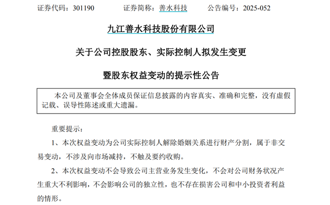 【导读】实控人进行离婚财产分割,善水科技实控人变更为吴新艳