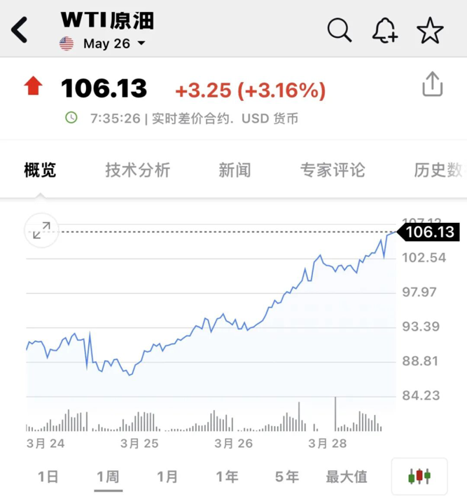截至发稿,WTI原油期货报106.13美元,日内上涨3.16%。