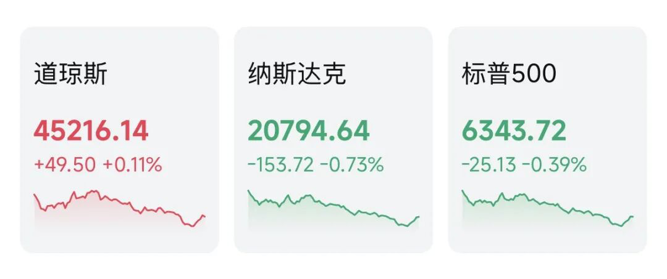 截至收盘,道指涨0.11%,报45216.14点;纳指跌0.73%,报20794.64点;标普500指数跌0.39%,报6343.72点。