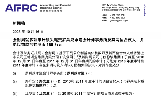 公告显示,会财局鉴于罗兵咸永道会计师事务所、郑广安及江令言就香港上市公司王朝酒业集团截至2010年12月31日年度及2011年12月31日年度期间的审计存在多项与收入确认方面相关的缺失,对其作出相应处分。