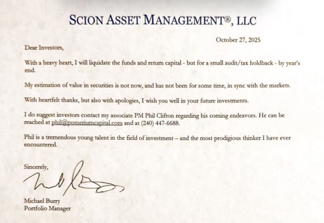 事实上,在一封10月27日的致投资者信中,贝瑞就已经宣布将清算基金并返还投资者资金,并提到对市场估值的失望。