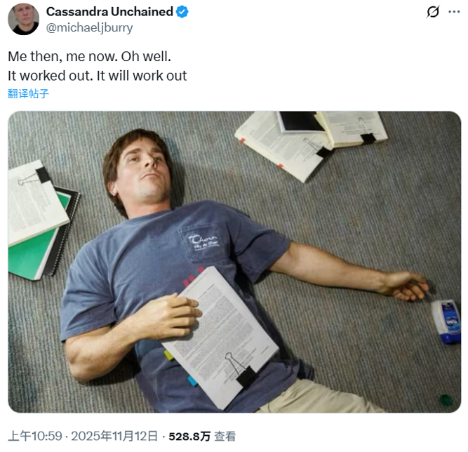 此外,他再度在社交媒体上发布了一张“大空头”的剧照,隐喻“此时此刻正如彼时彼刻”,而这一切终将水落石出。