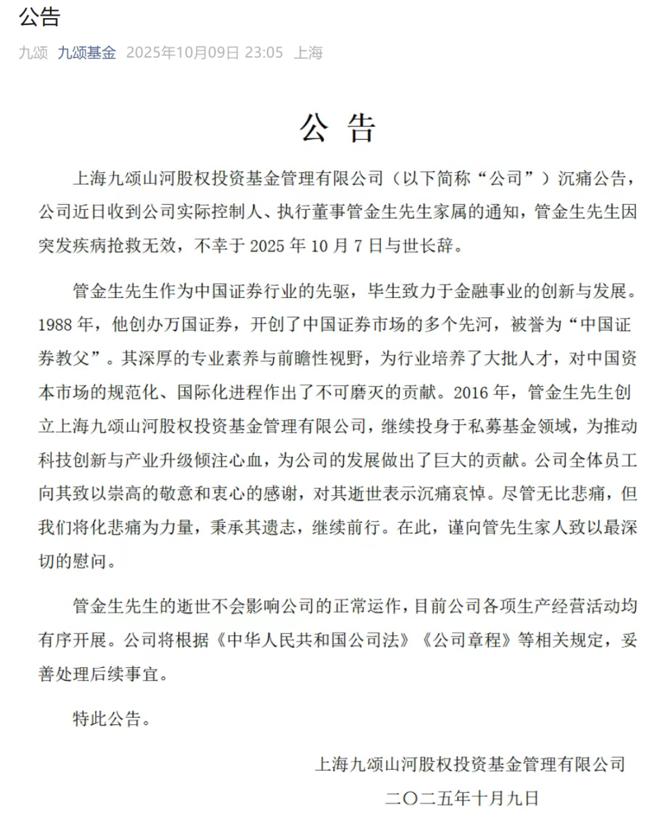 10月9日深夜11点,上海九颂山河股权投资基金管理有限公司(以下简称九颂基金)发布公告称,近日收到公司实际控制人、执行董事管金生先生家属的通知,管金生先生因突发疾病抢救无效,不幸于2025年10月7日与世长辞。
