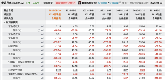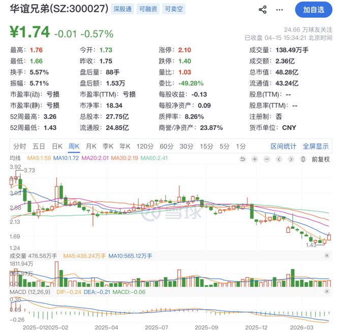 截至4月15日收盘,华谊兄弟股价报1.74元/股,总市值为48亿元。