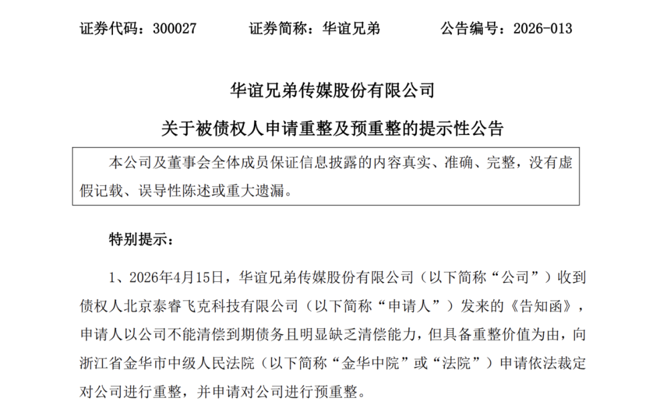 4月15日,华谊兄弟发布公告称,公司收到债权人北京泰睿飞克科技有限公司(以下简称泰睿飞克)发来的《告知函》,申请人以公司不能清偿到期债务且明显缺乏清偿能力,但具备重整价值为由,向浙江省金华市中级人民法院申请依法裁定对公司进行重整,并申请对公司进行预重整。