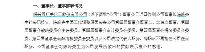 记者注意到,贝斯美今年7月21日曾发布公告称,陈峰因工作调整辞去公司董事长、非独立董事、法定代表人及相关委员会职务,辞职后不再担任公司任何职务。同时,公司补选现任董事兼总经理钟锡君为董事长。