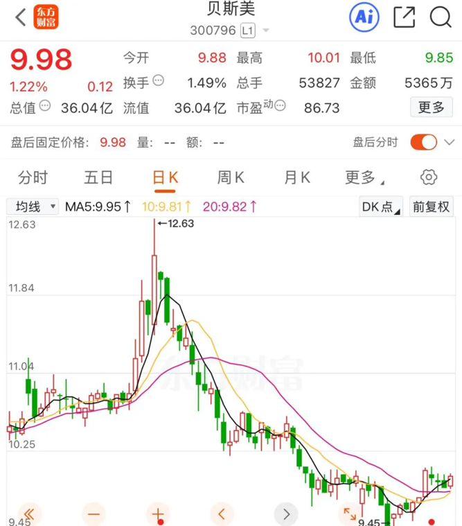 截至10月31日收盘,贝斯美报收于9.98元/股,总市值为36.04亿元。