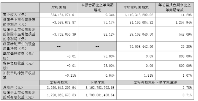 最新财报显示,今年前三季度公司实现营业总收入11.1亿元,同比增长14.29%;归母净利润为3116.67万元,同比增长1257.94%;扣非净利润为2910.8万元,同比扭亏。