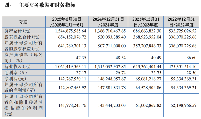 2022年、2023年、2024年及2025年上半年,蘅东光的营业收入分别为4.75亿元、6.13亿元、13.15亿元及10.21亿元,归母净利润分别为5533.44万元、6452.85万元、1.48亿元及1.43亿元。