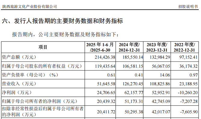 2022年、2023年、2024年及2025年上半年,陕西旅游的营业收入分别为2.32亿元、10.88亿元、12.63亿元及5.16亿元,归母净利润分别为-7207.28万元、4.27亿元、5.12亿元及2.04亿元。