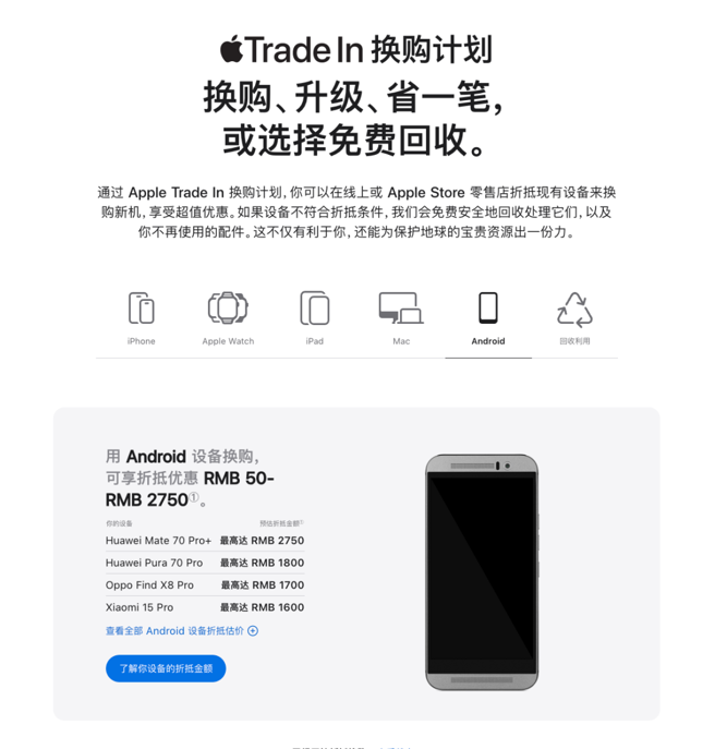 苹果官网显示,在最新的Apple Trade In换购计划中,华为、小米等安卓品牌已被纳入以旧换新范围。