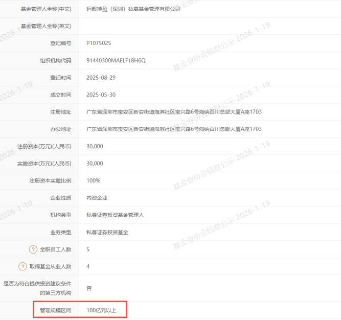 2025年5月底成立的恒毅持盈(深圳)私募,2025年底管理规模为0至5亿元,在2026年1月开年后,规模迅速攀升,一举突破百亿元。