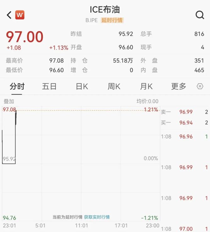布伦特原油突破97美元/桶